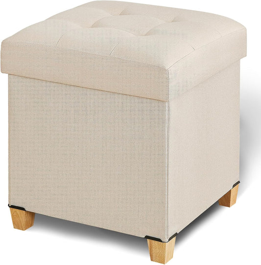 17.7" Square Ottoman with Storage, Storage Ottoman Foot Stool with Lid & Solid Wood Legs, Linen Ottomans for Living Room, Bedroom, Dorm, Beige