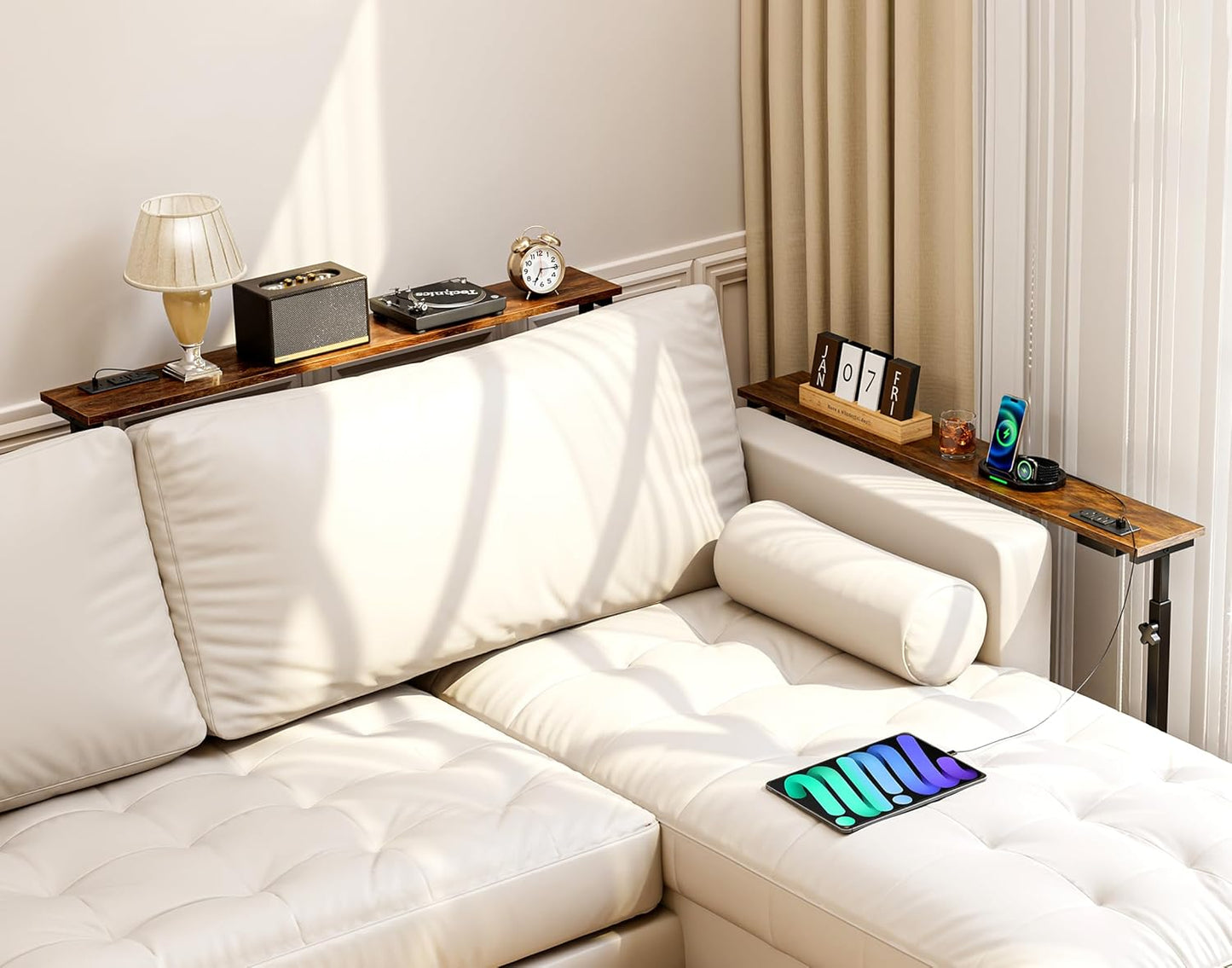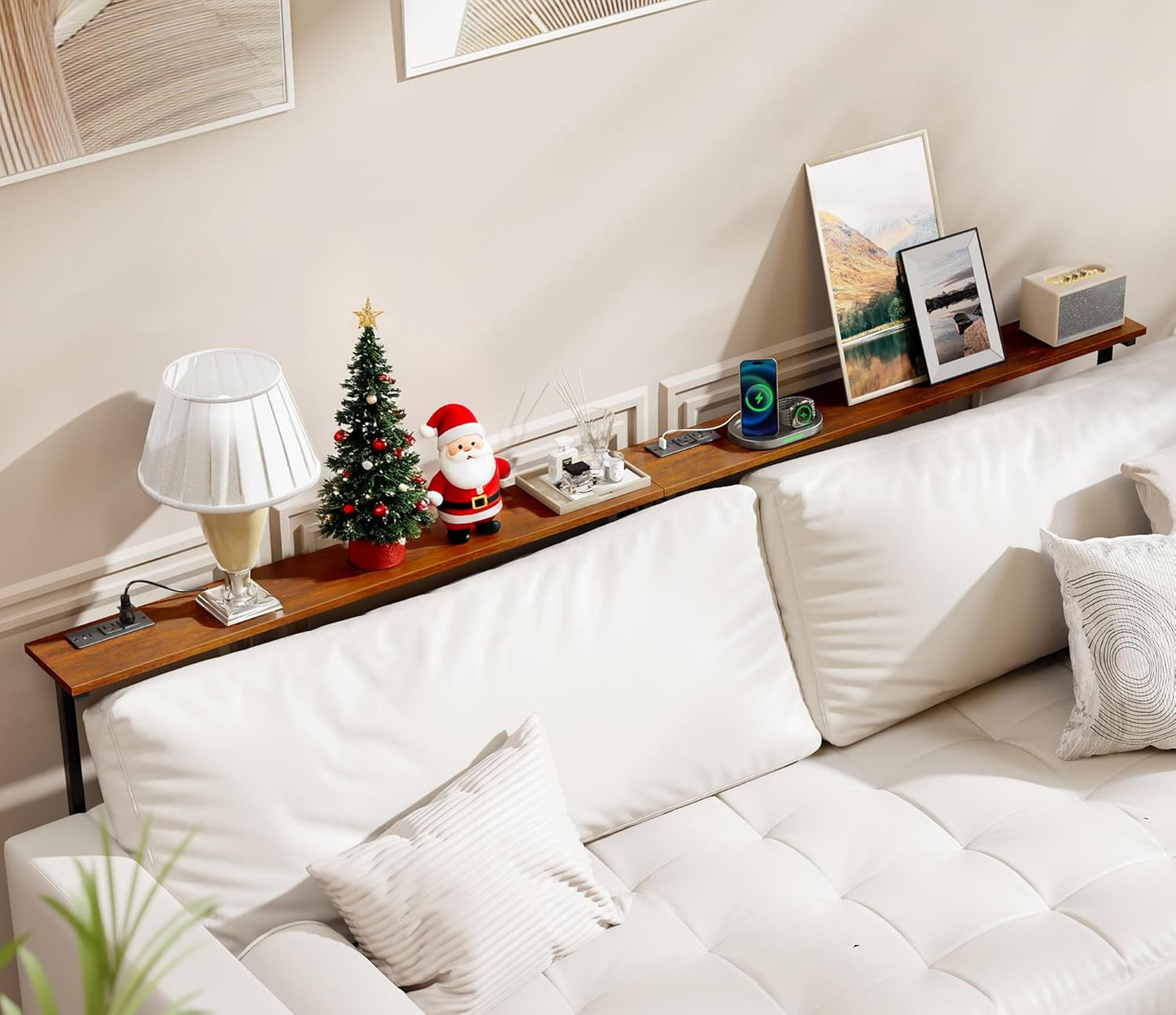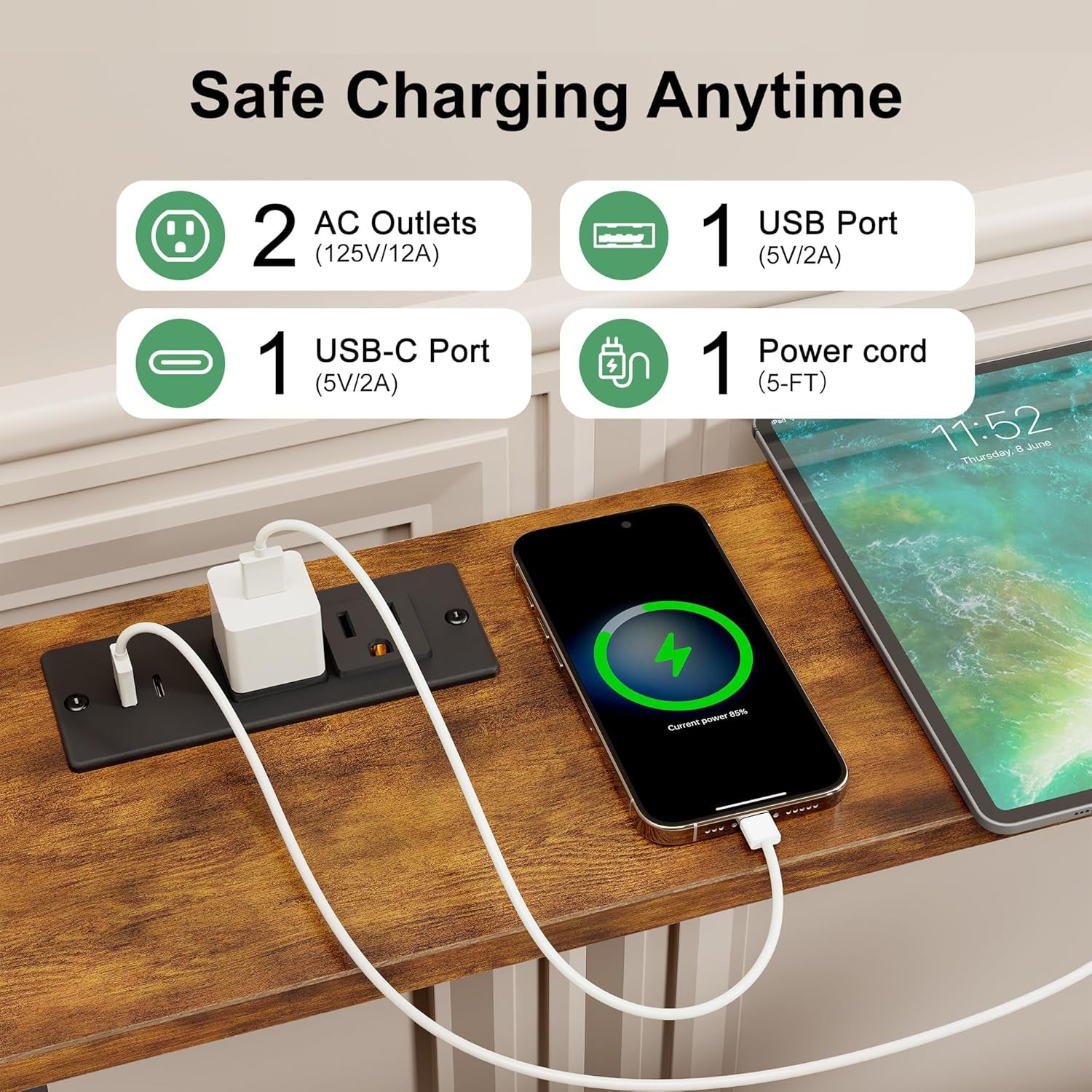 - [Upgraded Charging Station with Safety Switch]: This narrow console table features 2 AC outlets, 1 USB port, and 1 USB-C fast-charging port, along with a 4.9ft power cord for convenient access to power. Whether you’re charging phones, tablets, or laptops, the built-in control switch allows you to cut power with a single press—making charging safer, smarter, and more energy-efficient.