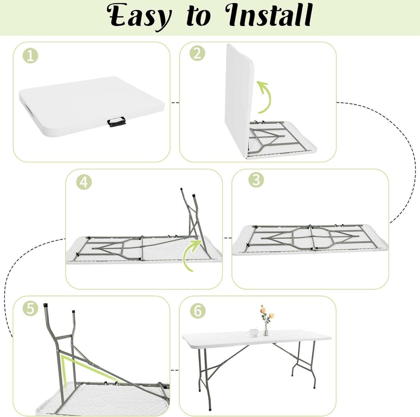 - Foldable and Portable Design: The 6 FT folding table can be conveniently folded in half and secured with a safety buckle. Only half of the tabletop area after folding that saves your storage space, making it easy for storing in your car trunk. It features a portable handle, lightweight tabletop and frame, makes it easy to carry by one person after folding.