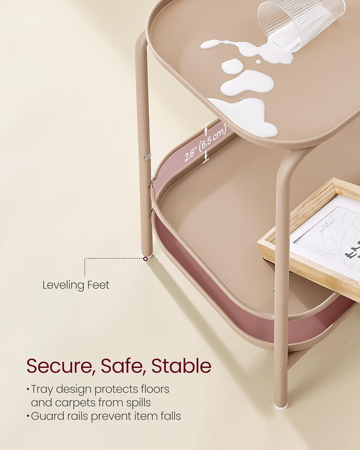 - 【SECURE, SAFE, STABLE】This tray design protects floors and carpets from spills, while preventing small items like electronics from sliding off. Guard rails keep taller items like vases secure. Adjustable feet ensure stability on slightly uneven floors