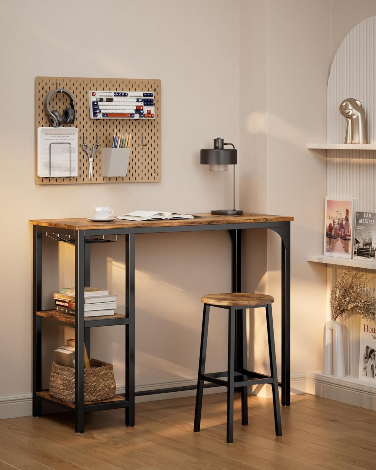 - Ample Storage Space: Bar table with stools creates ample storage in a limited space. To make the bar table versatile, the table is specially designed with two-layer storage space and 2 rows of wine glass rack. You can store kitchen utensils, food as needed