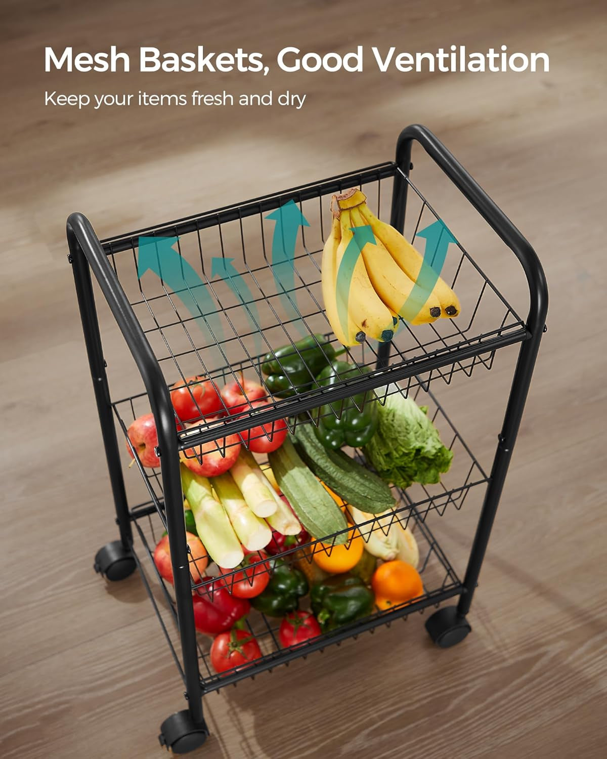 - [Flexible and Breathable Baskets] The removable top and bottom baskets of the rolling storage cart are great for daily use. The breathable baskets ensure proper air flow, preventing vegetables and fruits from spoiling