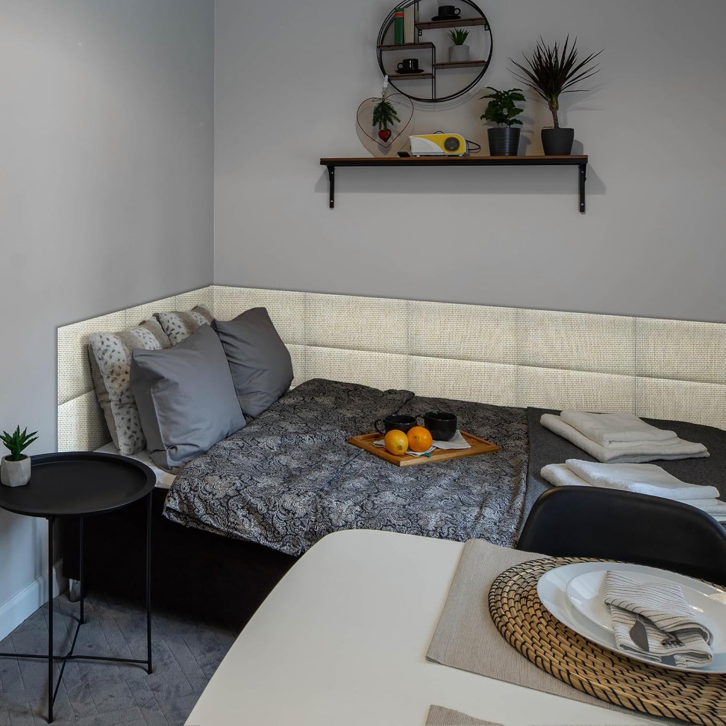 - SAFETY & NOISE REDUCTION: Upholstered wall panels are impact resistant and can be used in children's recreation rooms, bedrooms, next to beds and around beds to prevent injuries due to bumping. And with good sound insulation, it can be used in recording studios, conference rooms, home theatres, offices and so on