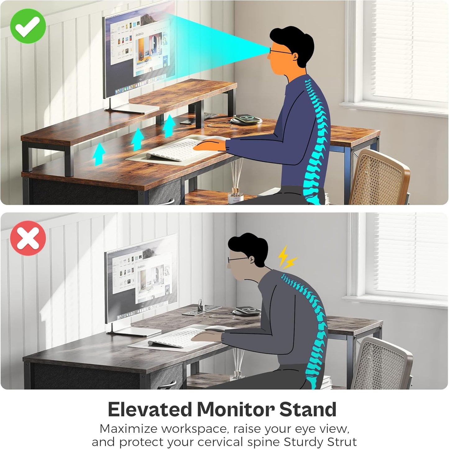 - 【Desk with Power Outlets】4 AC outlet, 2 USB ports and 1 Type-C port on the gaming computer desk allow you to charge your monitor, office or gaming devices with ease. And the monitor stands help to elevate your eye lines, avoiding neck and back pains. Super considerate writing desk.