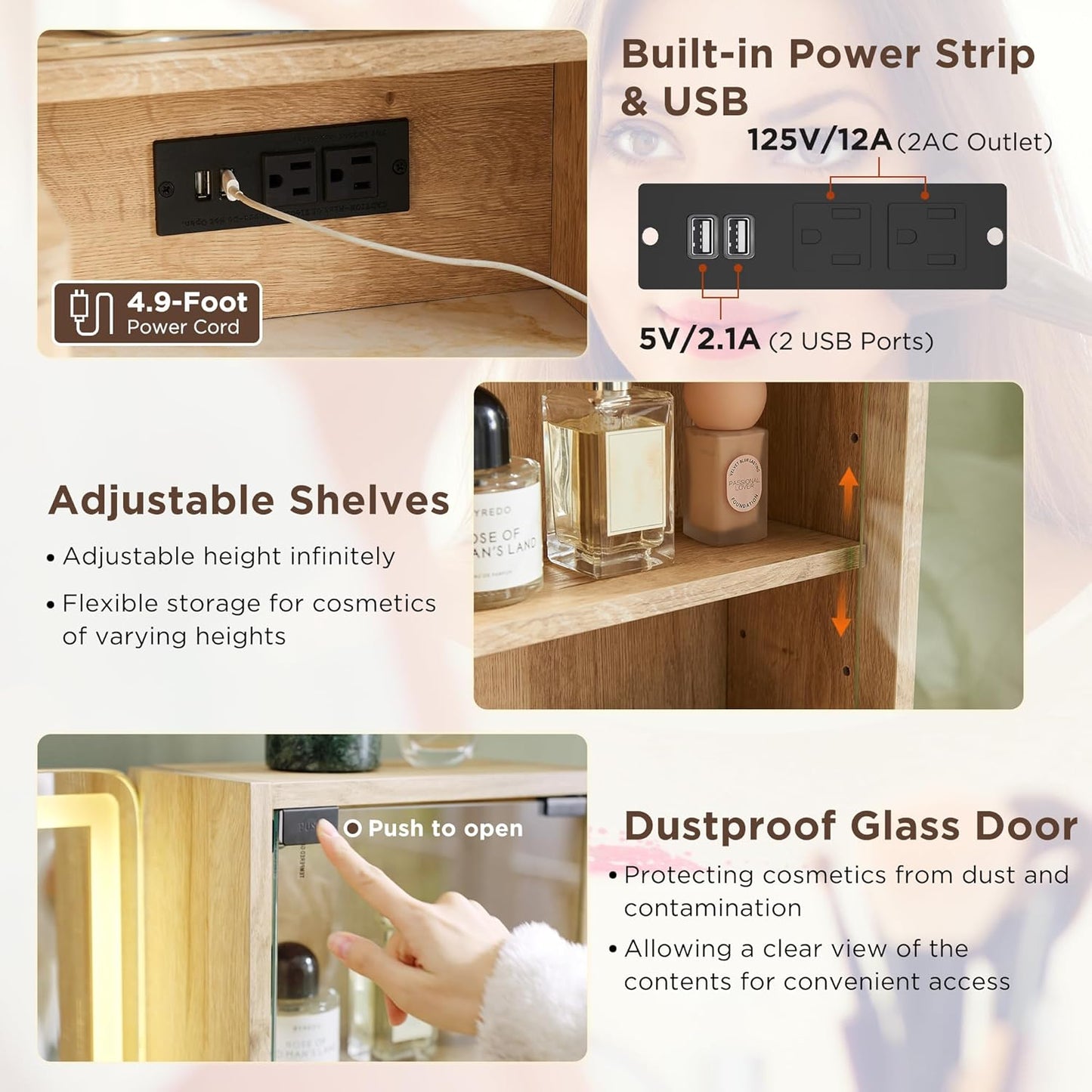 - 【Versatile-Visible & Charge】We've meticulously designed a transparent toughened glass tabletop vanity makeup table, providing a clear view of the neatly organized drawers in the dressing table. Additionally, there's a built-in charging station on the side for convenient use of curling irons, hairdryers, beauty devices, and phone charging. The power outlets don't take up tabletop space, enhancing safety and usability. Our vanity is made from FSC-Certified wood