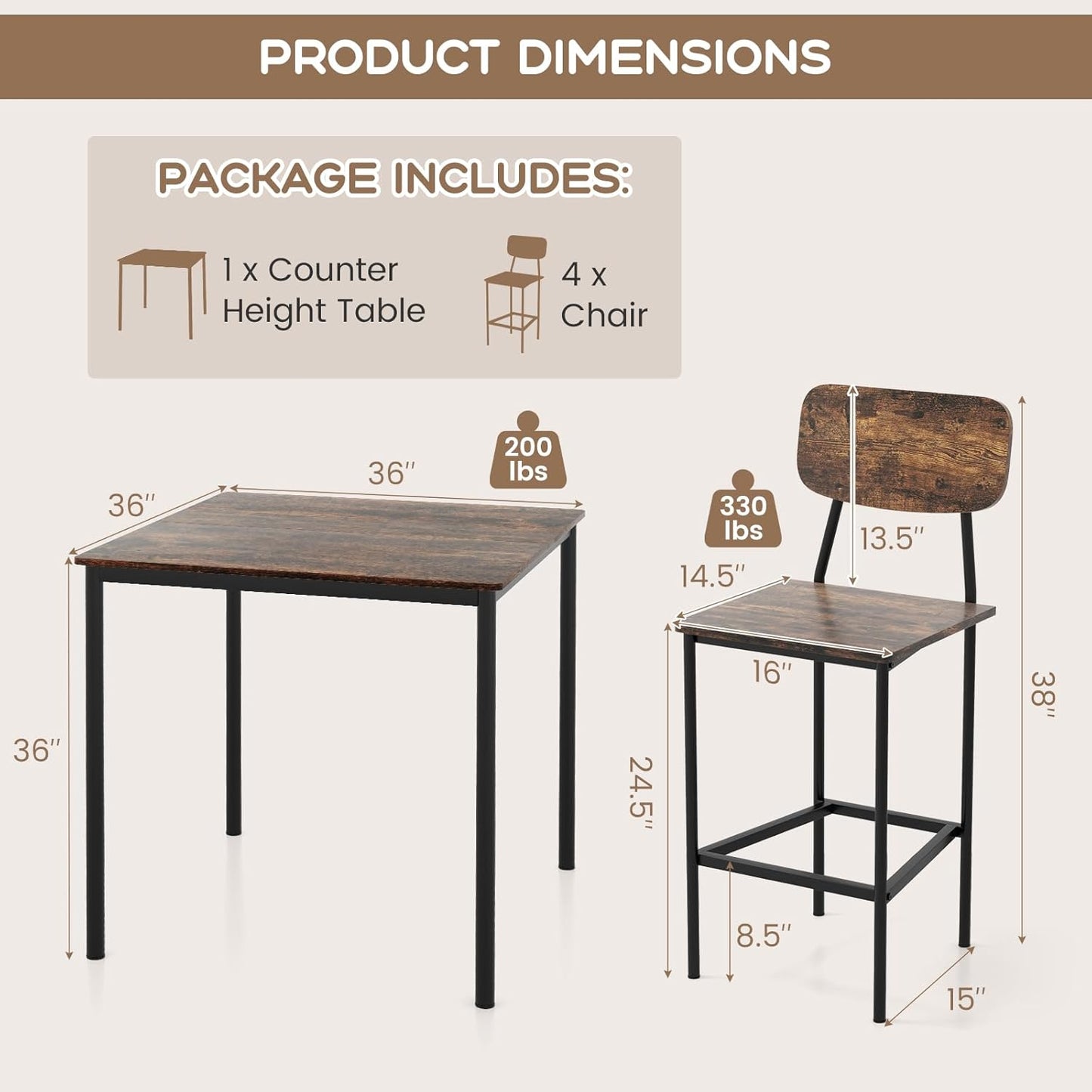 5-Piece Dining Table Set W/Counter Height Table & 4 Bar Stools, Industrial Kitchen Dining Set W/Footrest & Backrest, Space-Saving Dinette Set for Pub, Dining Room, Restaurant (Mix Brown)