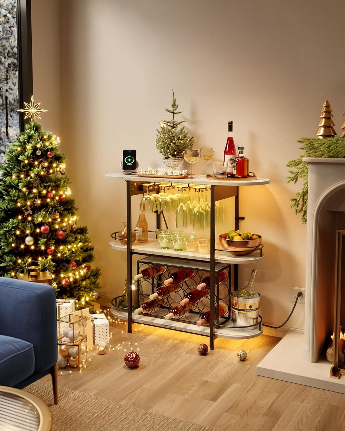 Bar Cabinets for Home, LED Coffee Bar with Power Outlets, Home Mini Bar for Liquor, Freestanding Wine Rack with Glass Holder, Kitchen, Dining Room, Rustic White ULWR007W01