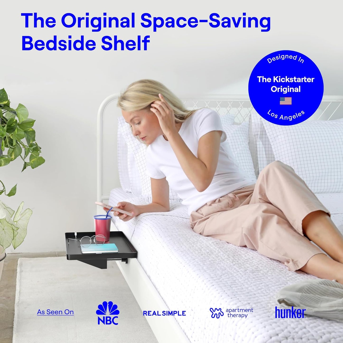 - ORIGINAL, TRIED & TRUE DESIGN: Launched from Kickstarter and designed in Los Angeles, the Bedshelfie bedside shelf has been featured on top publications such as Apartment Therapy, BuzzFeed, and Real Simple. Our original bed shelfie bed shelf organizer table helps small space dwellers make the most out of their space, from those in tiny bedrooms to college students in need of a top bunk bedside table. It is the preferred choice for bed side organization and storage.