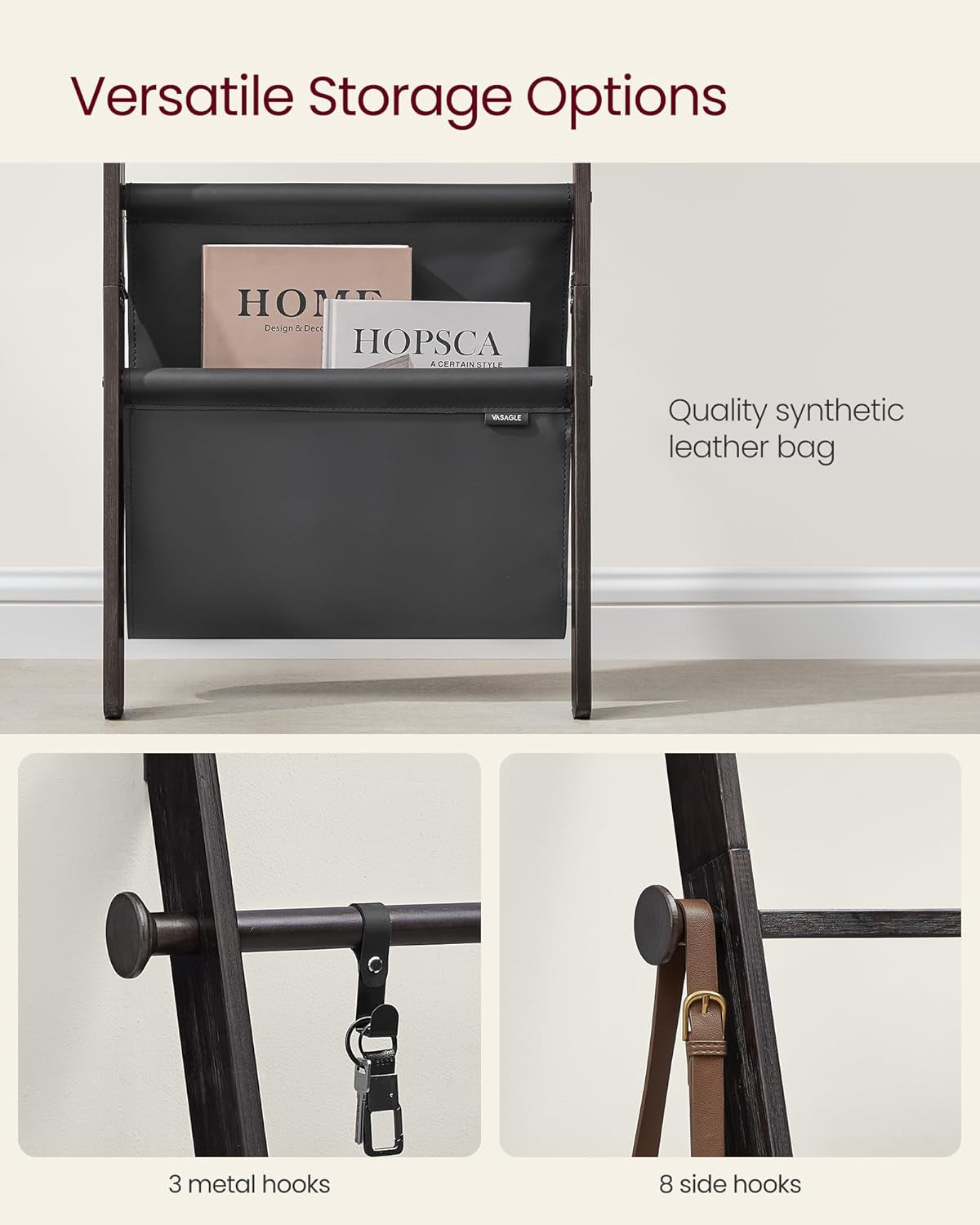 Blanket Ladder for Living Room, 5-Tier Wooden Ladder Shelf, Decorative Farmhouse Blanket Rack with Synthetic Leather Bag, Metal Hooks, Side Hooks, for Bedroom, Ink Black ULLS022B01