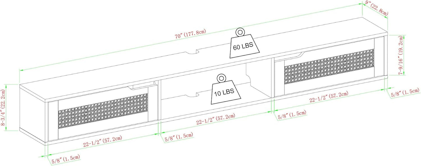 Channel surf in style with the cool, coastal aesthetic of this floating TV stand. Create your favorite spot to hang around this stylish piece with its floating display and minimalist yet ample storage space. Use the middle open shelf to display your sound bar, streaming devices, or favorite décor while you conceal clutter behind the rattan doors. With sleek finger pulls on each door, cord management ports, and included wall-mounting hardware, your entertainment hub will be organized and ready to host a soiree or solo streaming sesh with contemporary finesse.