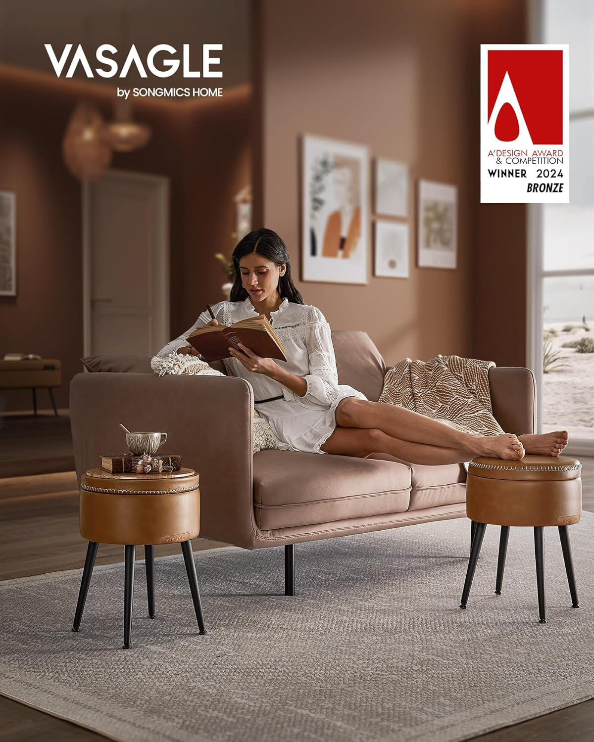 EKHO Collection - Storage Ottoman, Vanity Chair Stool, Synthetic Leather with Stitching, Mid-Century Modern, round Storage Seat with Steel Legs, Loads 330 Lb, Caramel Brown ULOM005K01
