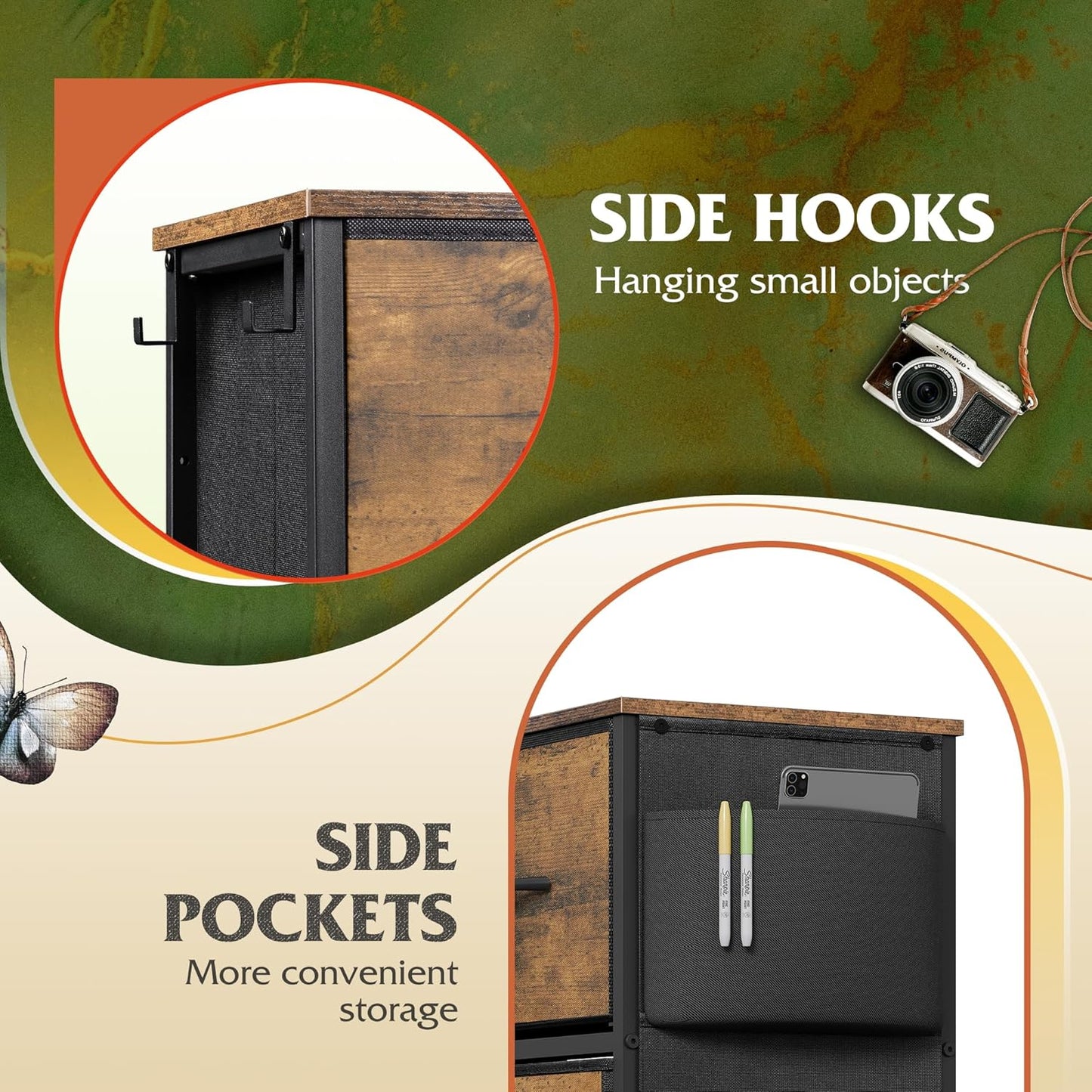 Fabric Dresser for Bedroom with 10 Drawers, Chest of Drawers with Side Pockets and Hooks, Sturdy Metal Frame, Drawers Organizer Unit for Living Room, Hallway, Rustic Brown Wood Grain Print