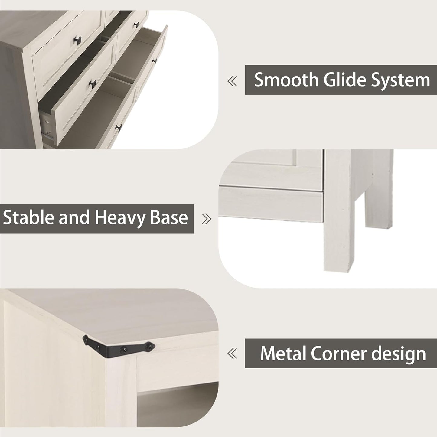 - Durable for Long Term Use: Constructed of sturdy MDF for sturdiness and durability. The top board can confidently hold up to 120 lbs, while the six drawers glide smoothly on rails, each supporting up to 30 lbs