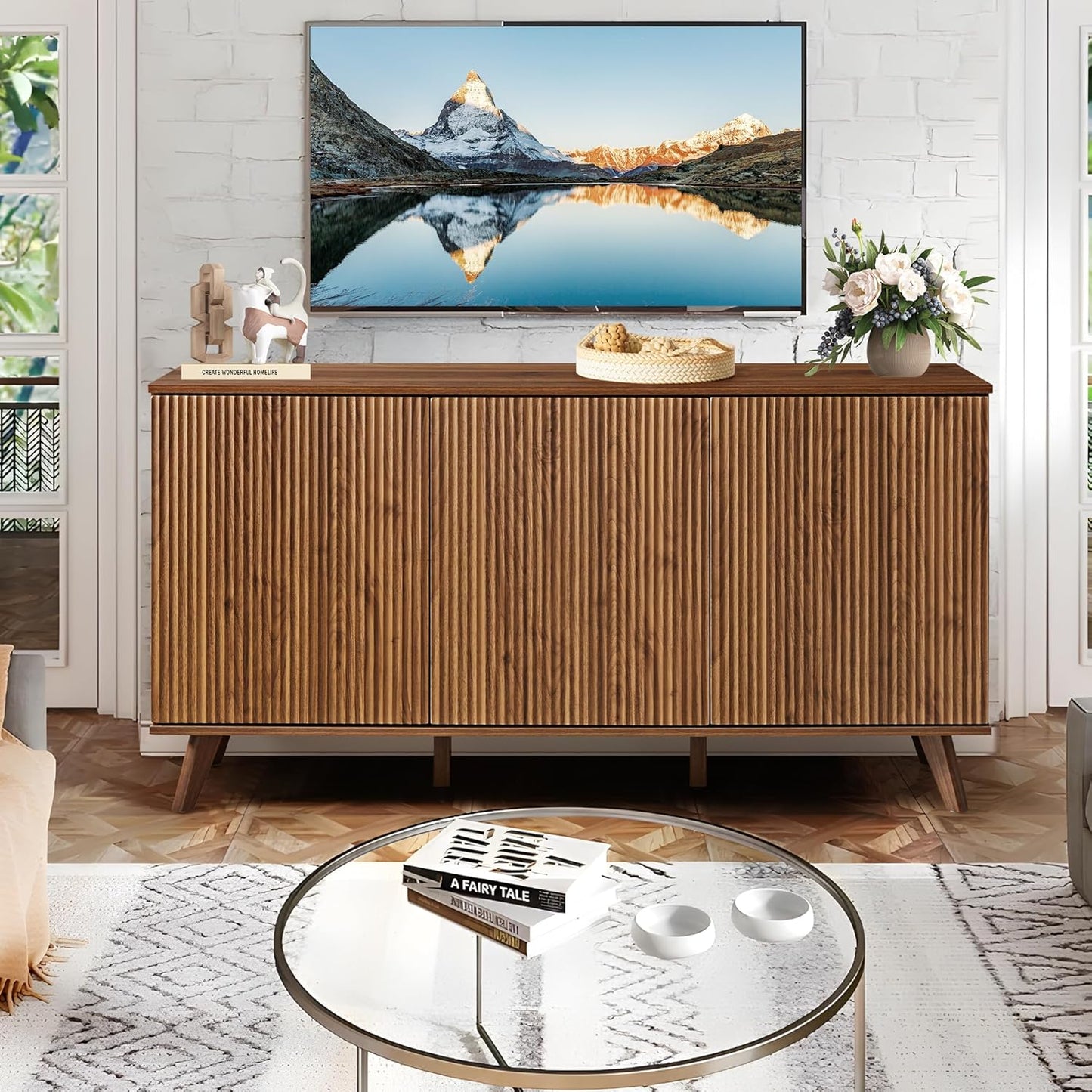 Fluted Sideboard Buffet Cabinet with Storage, Modern Storage Cabinet with 3 Doors, Wood Credenza Buffet Sideboards, Console Table for Kitchen Dining Living Room Entryway (Walnut)
