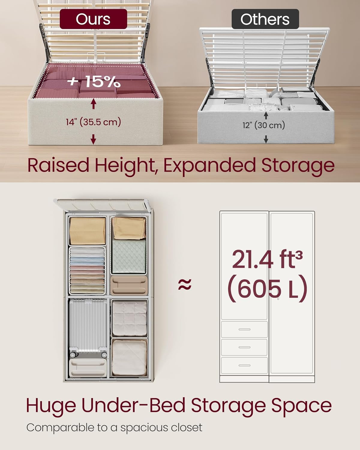 - Comfortable Upholstered Headboard: High-density foam wrapped in breathable, linen-like upholstery allows this lift-up storage bed frame to deliver optimal support and cushioning for bedtime reading or binge-watching