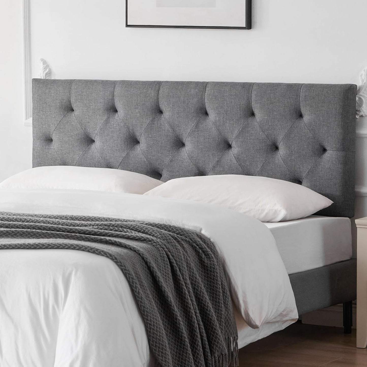 Linen Upholstered Headboard Queen Size, Modern Diamond Tufting Solid Wood Queen Headboard Only, Adjustable Height from 37” to 51” Head Board, Bed Frame or Wall Mount Headboards, Light Grey