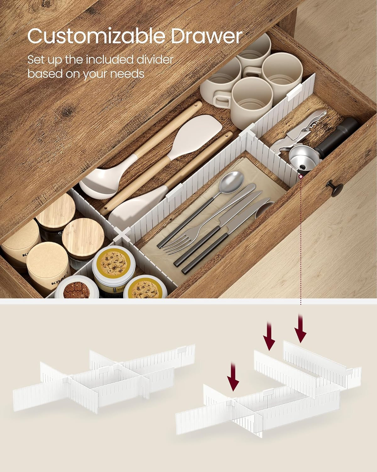 - Customizable Design: This buffet cabinet comes with an adaptable drawer divider to let you organize the drawer space as you need. The bottom cabinet features an adjustable shelf with 5 height options, allowing you to store items of different sizes