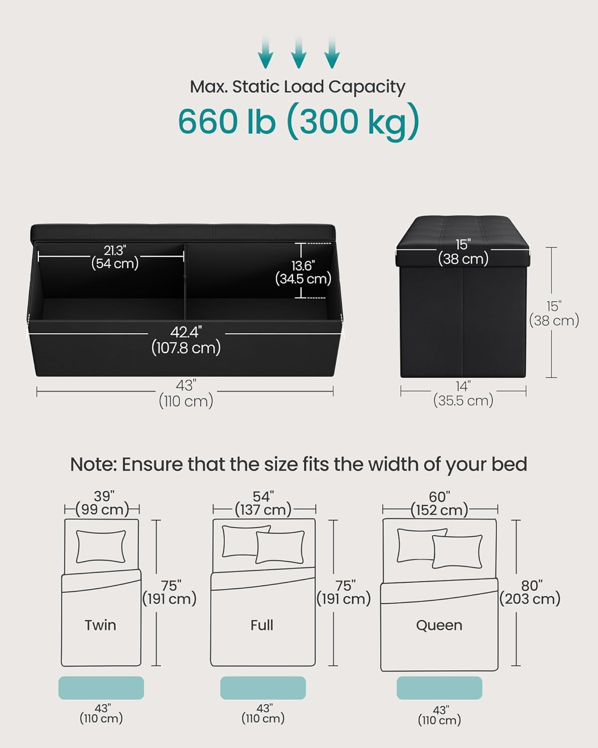 This SONGMICS storage ottoman is a perfect piece for your home. With its clever design, it can be used as a shoe bench in the entryway, a bed end bench, additional seats in the living room, or a simple storage unit for more space. Sit comfortably on this storage bench with thick padding and synthetic leather upholstery that is pleasant to the touch. It's supported by durable MDF for a static load capacity of 660 lb (300 kg).