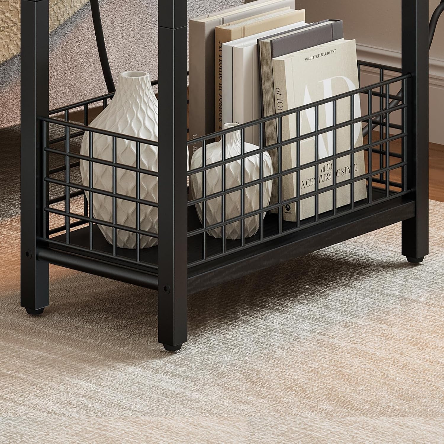 - 3-Tier Skinny Side Table With Open Storage: This end table's open shelves keep daily essentials accessible with a metal mesh basket for snacks, magazines, and remotes, saving your space from clutter. It also lets you display decor items like plants or photo frames