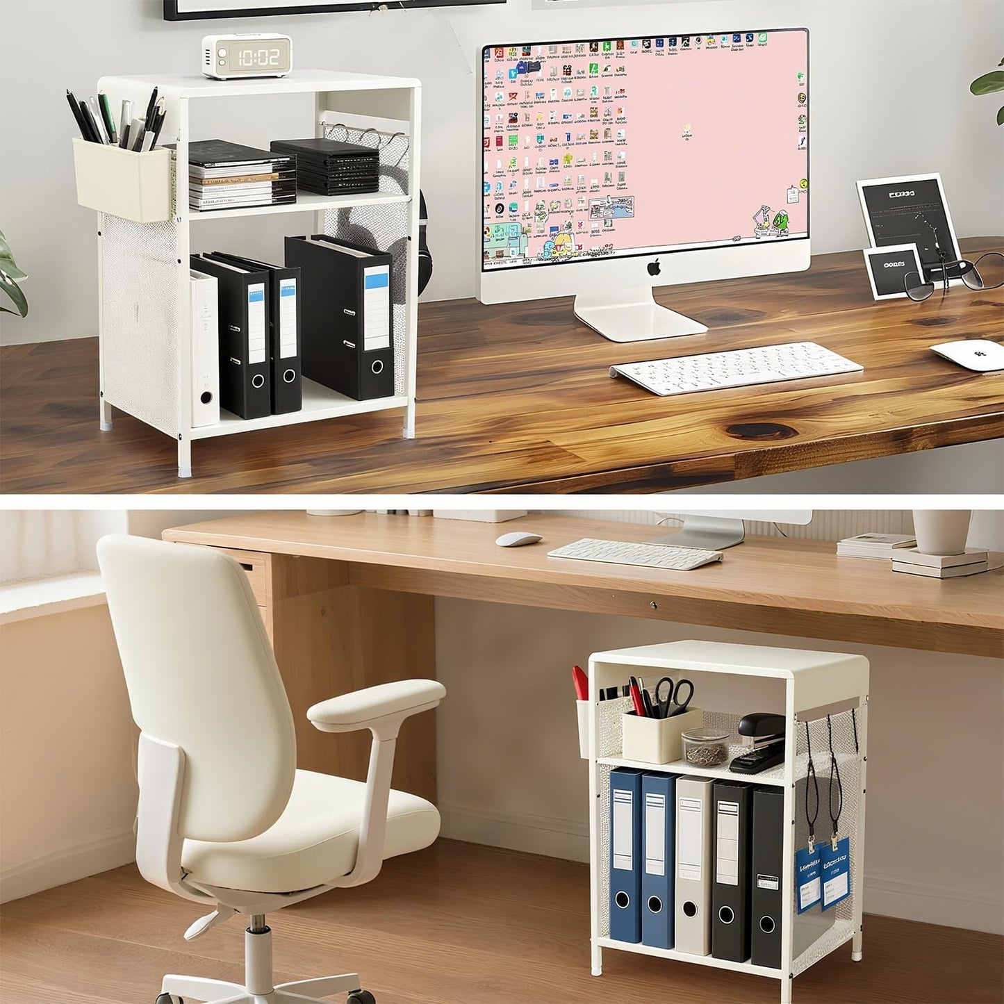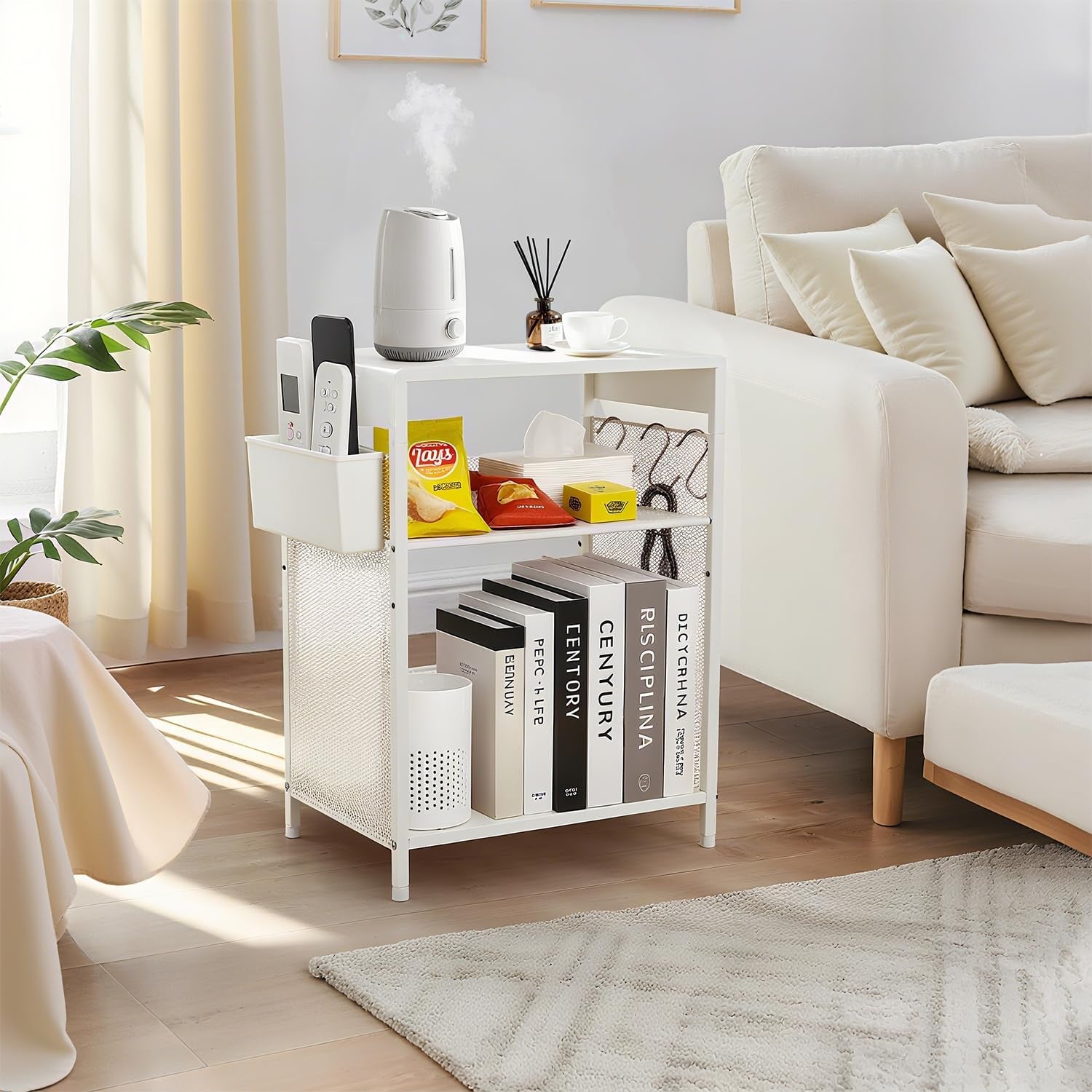 - { Aesthetic & Practical } The nightstand is compact and aesthetic as an accent furniture. You can organize your large stuff with the open storage rack and place your alarm, phone, cup on the desk top within easy reach. Also, you can put your handy items into the freely hung holder and hang your bags, hairbands and others to the S-hooks. Let’s keep your room always well organized