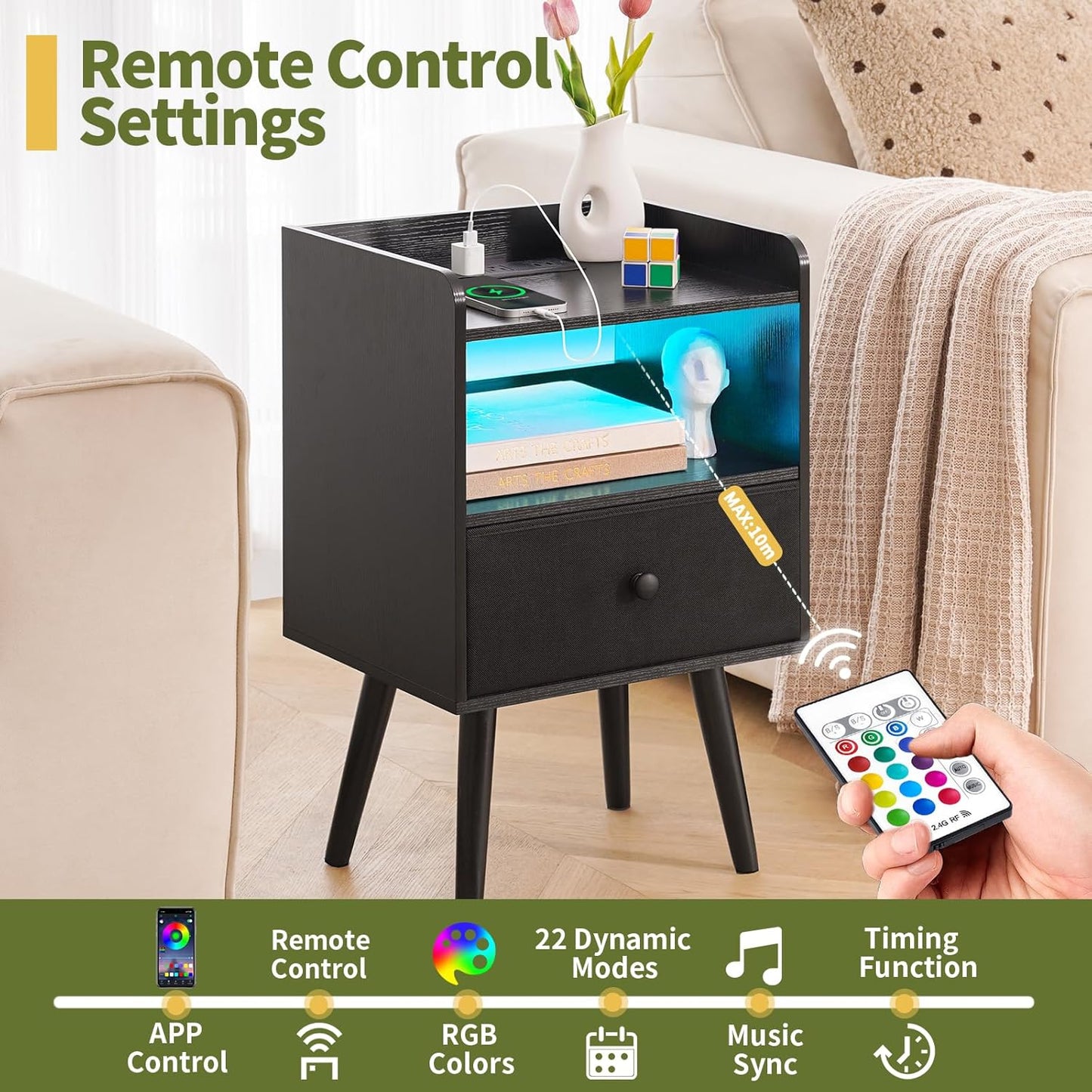 - Night Table with LED Lights: Yoobure mid century modern nightstand with LED lights is controlled via a switch, remote, or APP. You can choose from 22 dynamic modes/7 static modes, and sync the lights with your music for a cozy bedroom ambiance. Plus, set the timer for auto on/off lighting to suit your schedule.