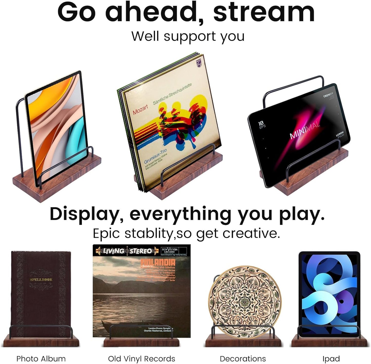 - 【Vinyl Record Display】:Our now-playing record stand won't take up too much tabletop space. 4 Non-slip pads under the record rack avoid sliding on the tabletop. Holds the heaviest vinyl and beyond, balanced and tip free,Pre-holes were set to easily insert support iron to keep records upright and easy to catch
