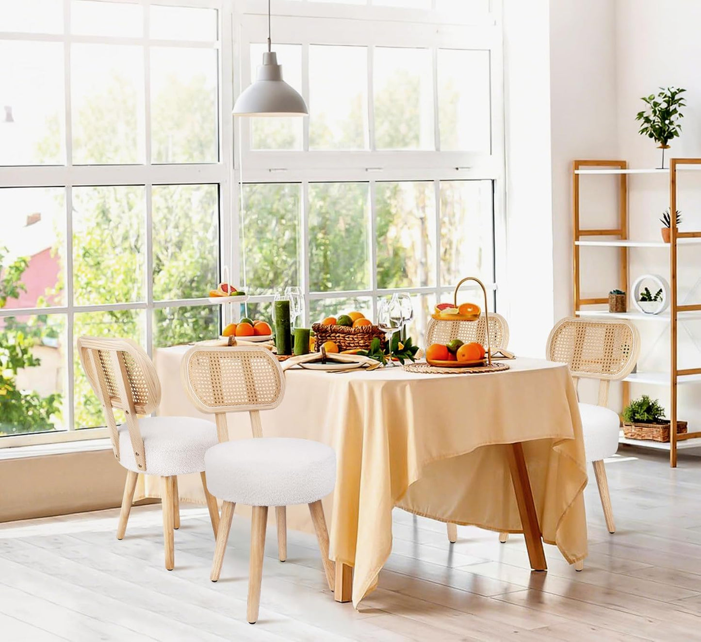 - 【Classic Cane Chair】– This mid century modern dining chair pairs with rattan backrest & white boucle seat, an great way to bring high-end style to the dining or living room. Blending seamlessly with your existing decor, this accent chairs brings a perfect amount of stylish function and carefree aesthetics to your home.