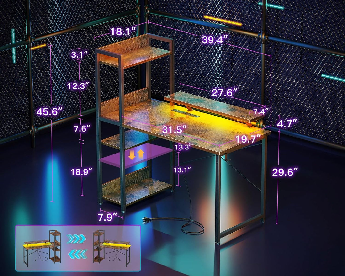 Reversible Gaming Desk with Power Outlets and LED Lights, 48 Inch Computer Desk with Storage Shelves and Monitor Stand, Modern Writing Study Desk for Home Office, Rustic Brown