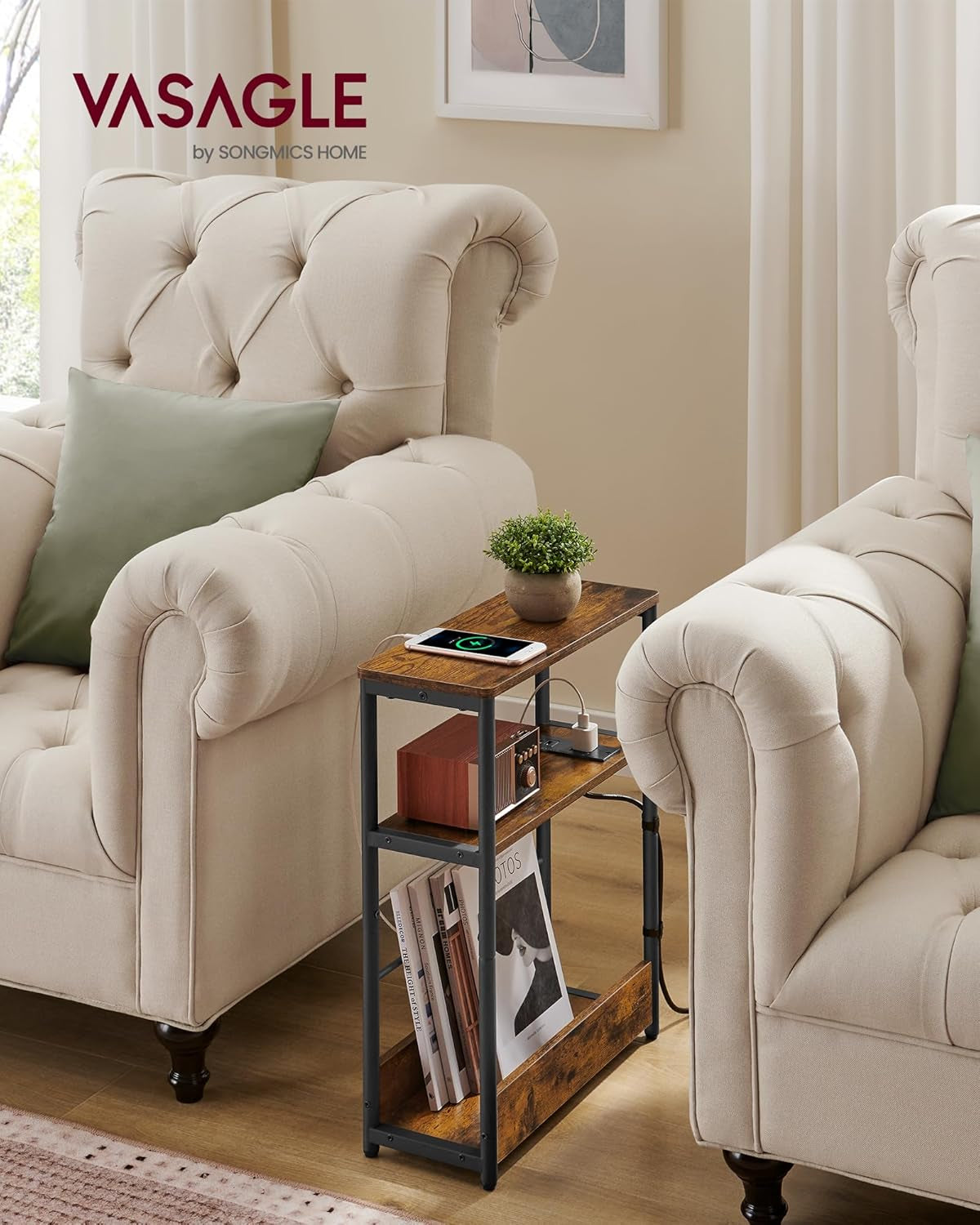 Side Table with Charging Station, Narrow End Table, 3-Tier Nightstand, Sofa Table for Small Spaces, Magazine Rack, for Living Room, Bedroom, Study, Rustic Brown and Ink Black ULET335K01