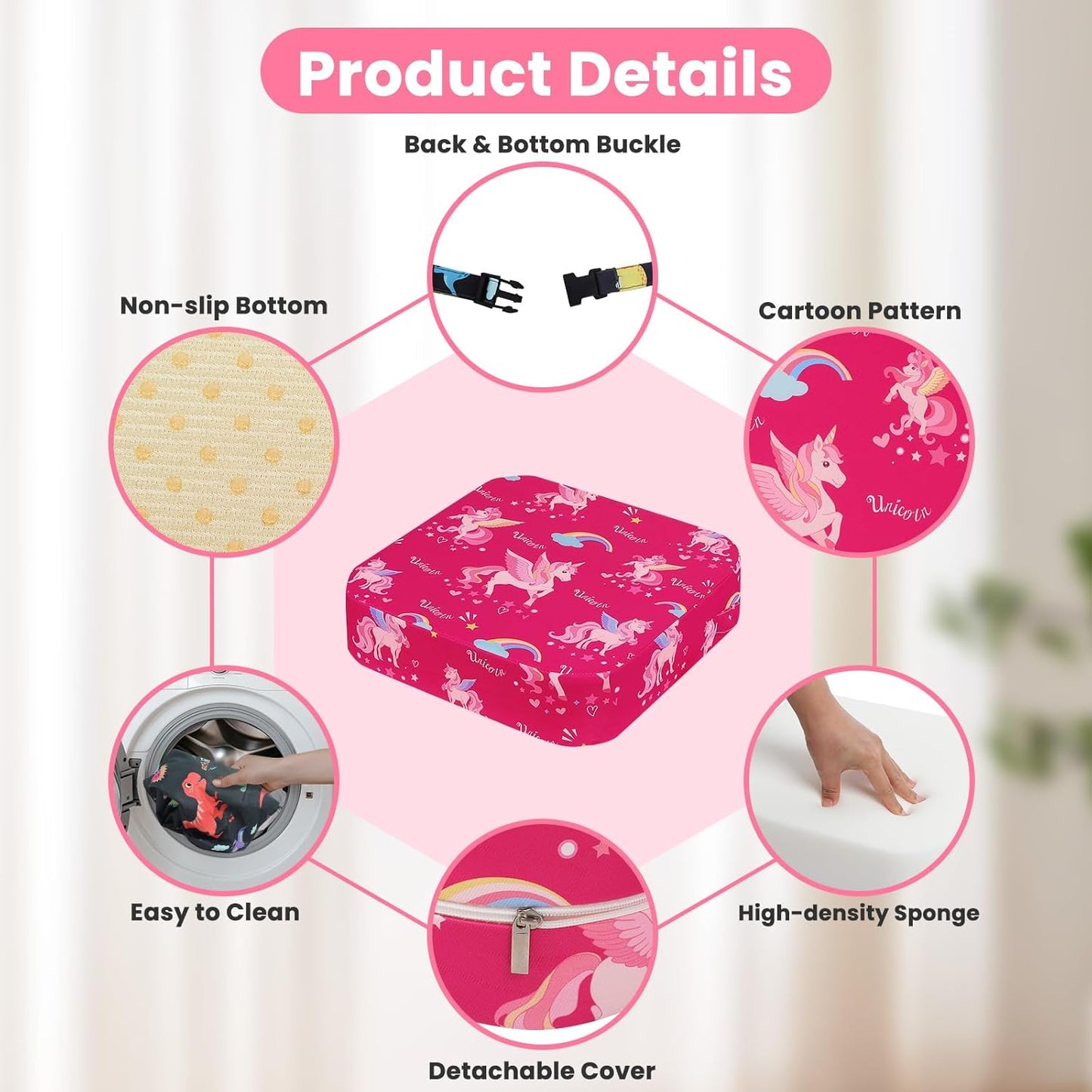Toddler Booster Seat for Dining Table, Kids Booster Seat for Kitchen Chair with Non-Slip Bottom, Portable Detachable Washable Increasing Cushion with 2 Adjustable Straps (Unicorn)