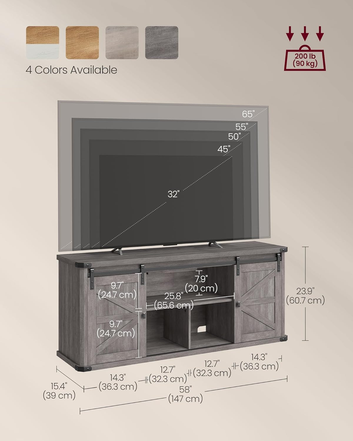 - [Sturdy and Stylish] Crafted with particleboard and MDF panels, this TV console table can hold up to 200 lb, providing sturdy support for your TV and other items. The unique barn doors and rustic finish bring a farmhouse vibe to your living space