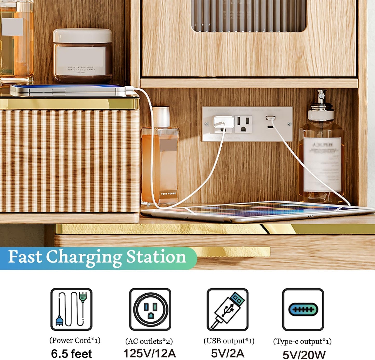 - 【Vanity Table with Charging Station】-This makeup vanity features a charging station, includes 2 standard plug sockets and 2 USB ports, which can be more convenient to connect your hair dryer, curling iron, and it can also charge your phone, tablet or other mobile devices, The unique design is more convenient for you to use.