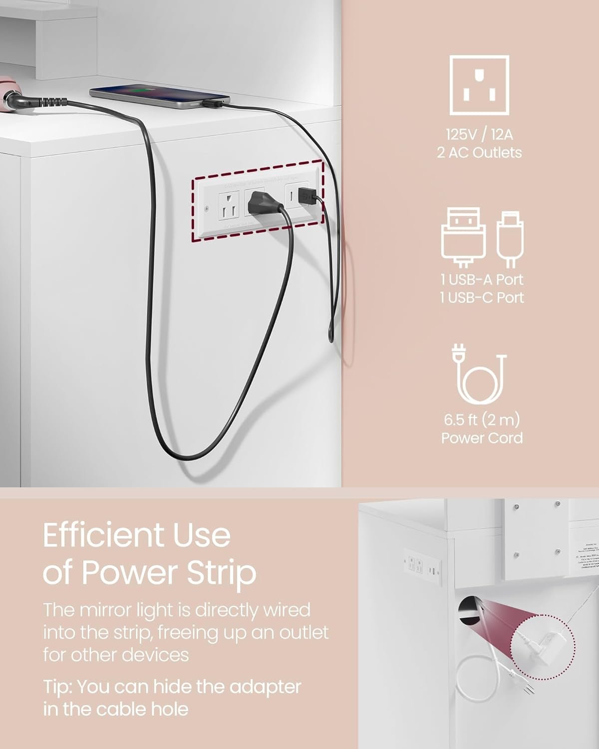 - 【CONVENIENT POWER HUB】The built-in power strip with 2 outlets, 1 USB-A, and 1 USB-C port conveniently powers your hair tools and charges your phone. The mirror's light is cleverly wired into the strip, freeing up an outlet for other appliances