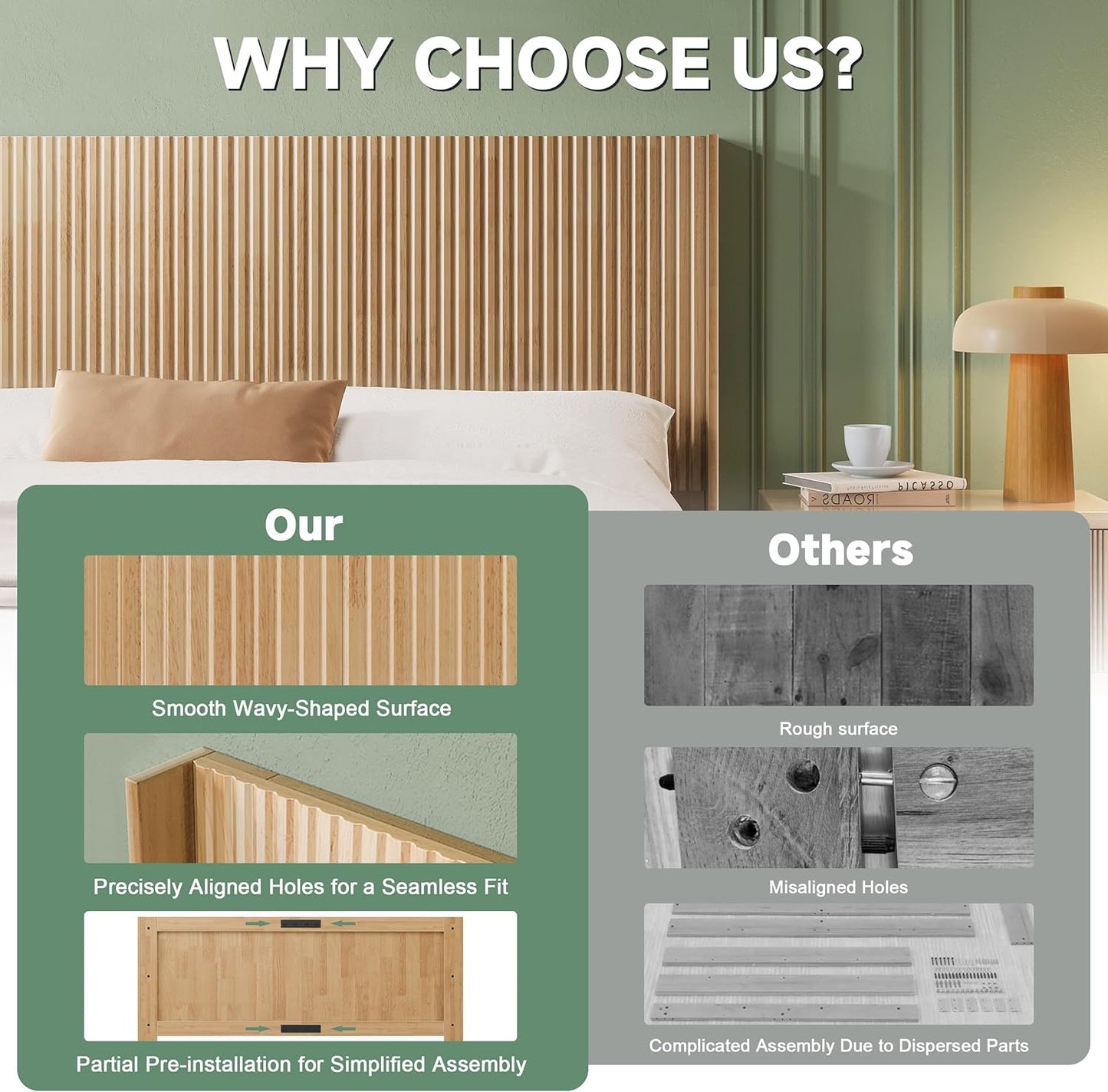 - Premium Durable Wood: This Queen wood headboard is made from high-quality natural rubber wood, offering exceptional durability. It's waterproof, scratch-resistant, and fade-resistant, ensuring long-lasting use and maintaining its vibrant look for years