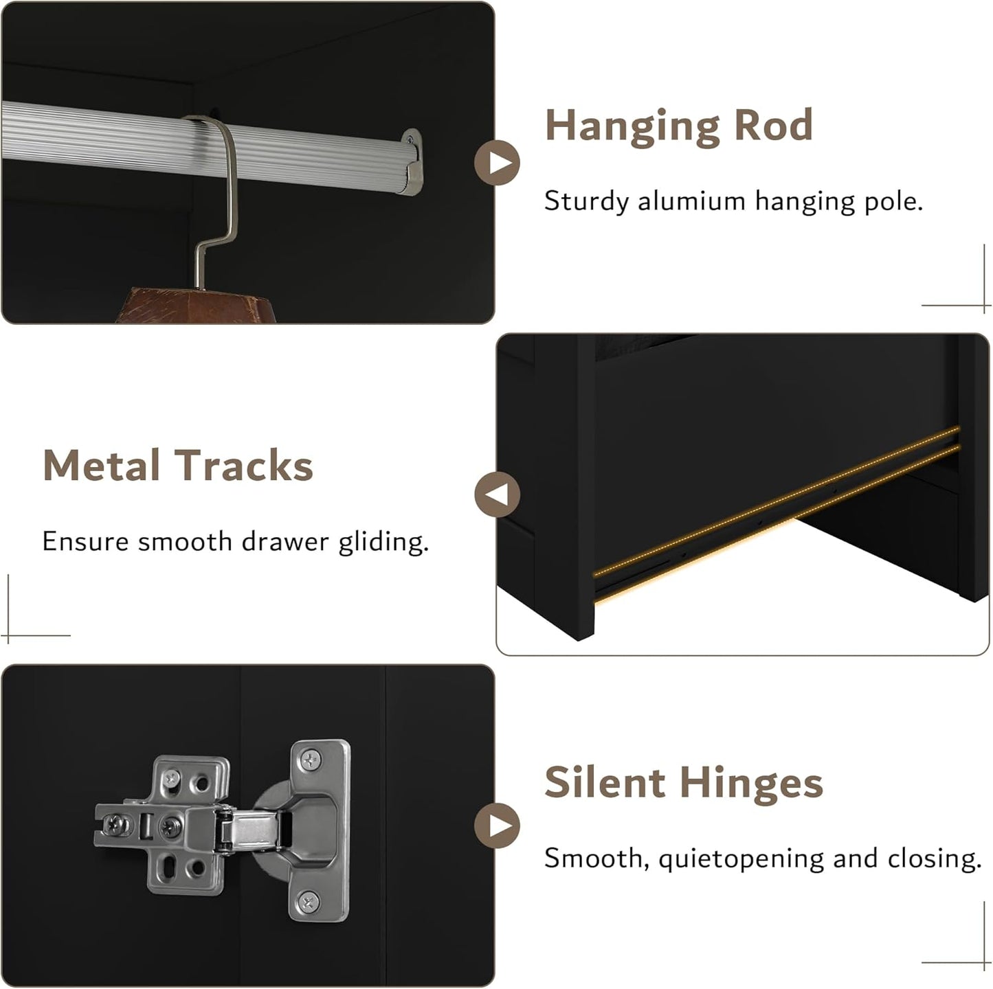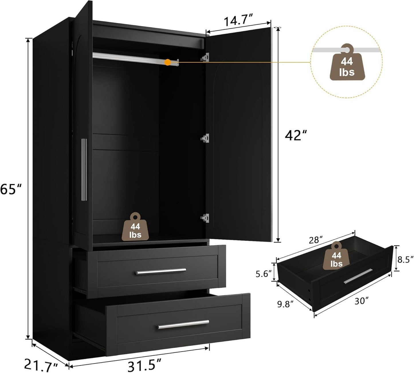 Wooden Armoire Wardrobe Closet with 2 Drawers, Clothing Storage Cabinet with Shelves Aluminum Hanging Rod, Wardrobe Storage with Strong Door Closure, Modern Bedroom Clothing Armoires, Black